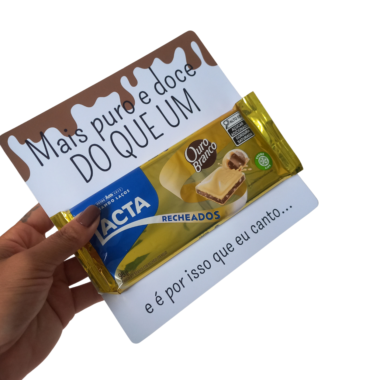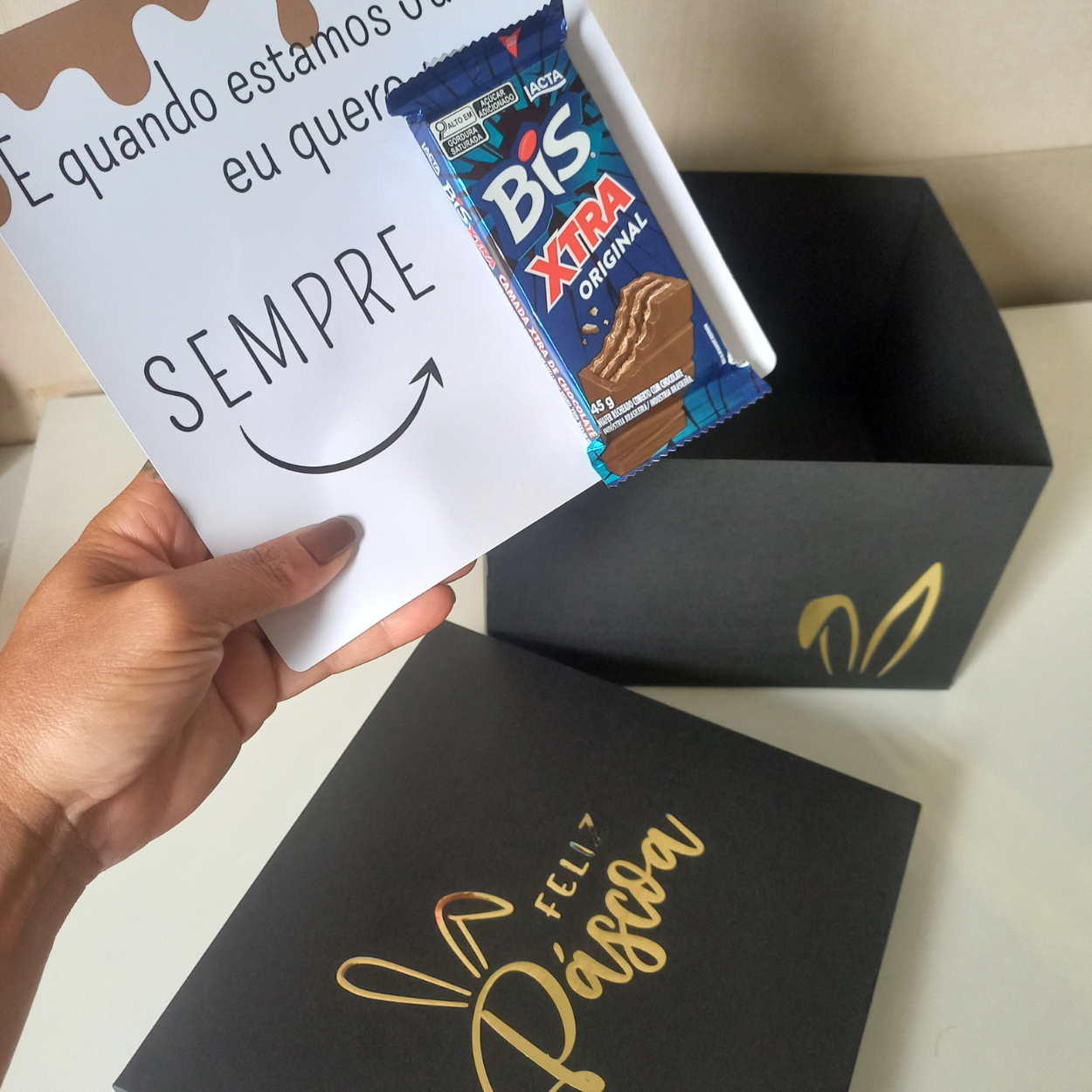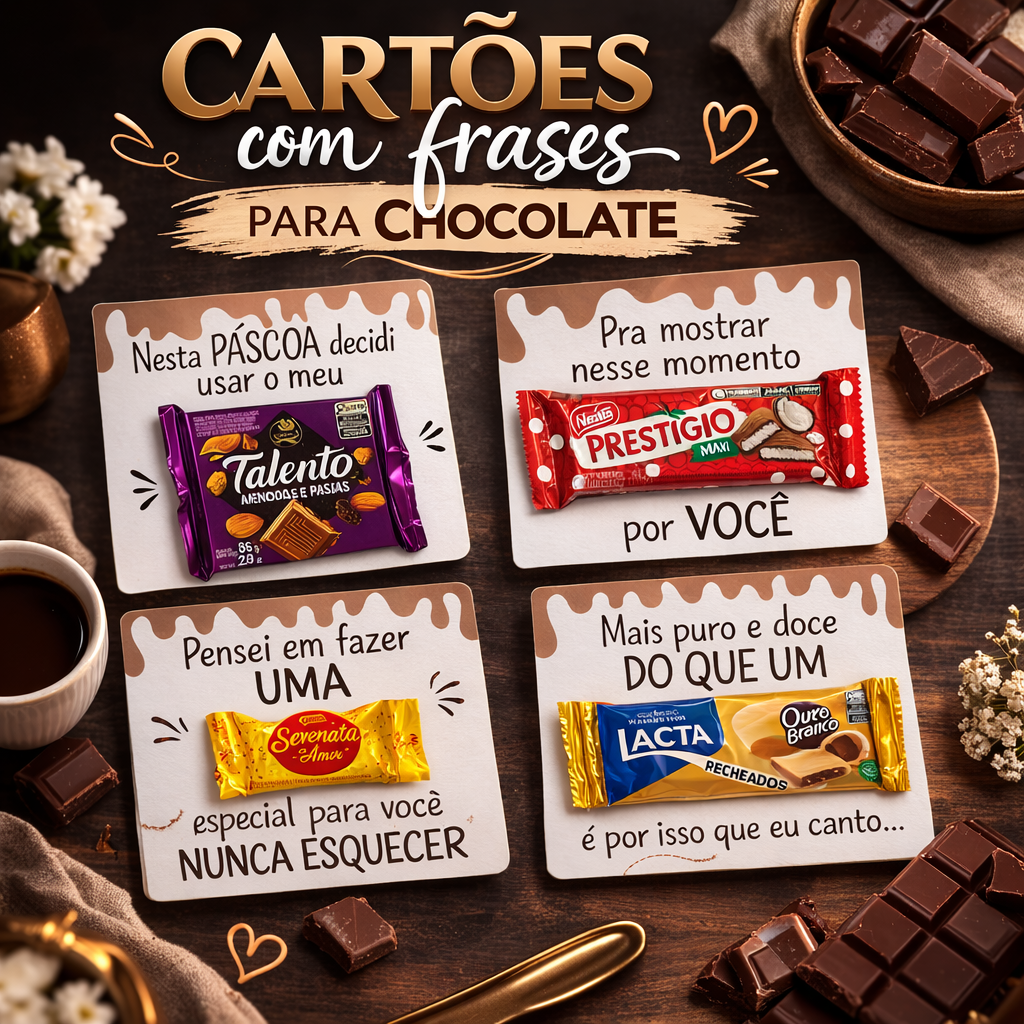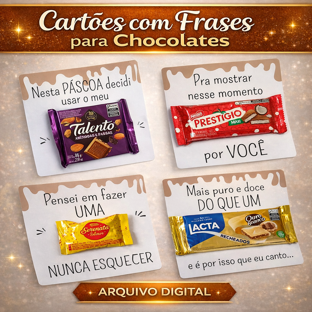 Este produto contém cartões com frases criativas desenvolvidos especialmente para presentear chocolates de forma personalizada na Páscoa. Os cartões foram criados para acomodar chocolates e transformar um simples presente em uma lembrança especial e criativa.
