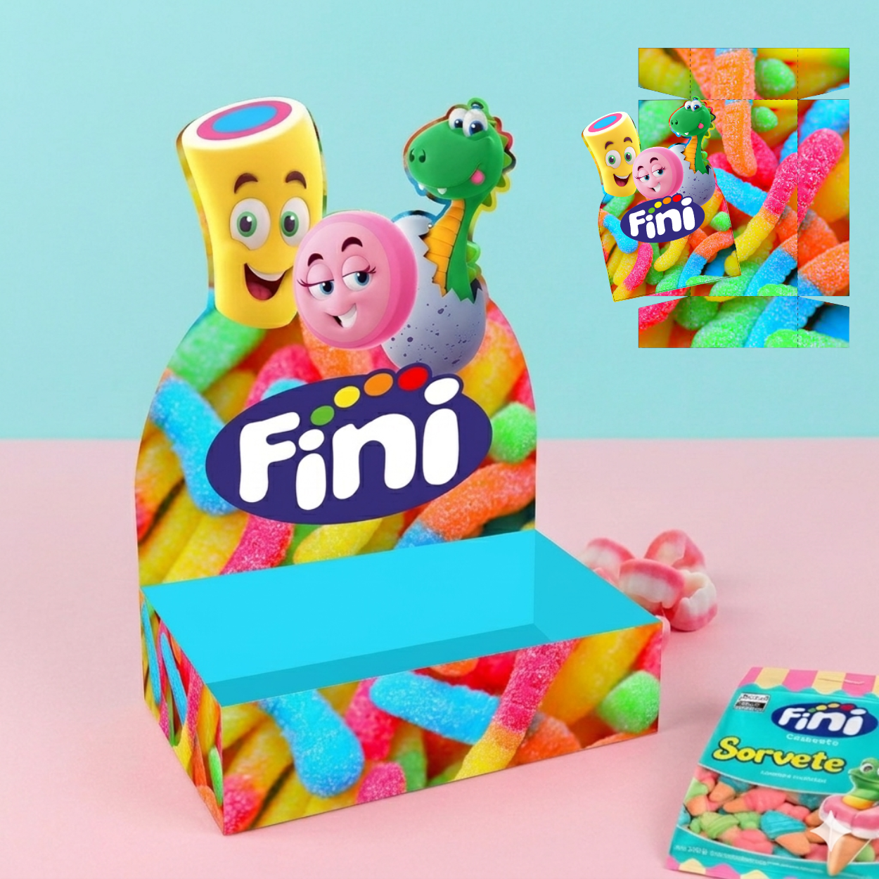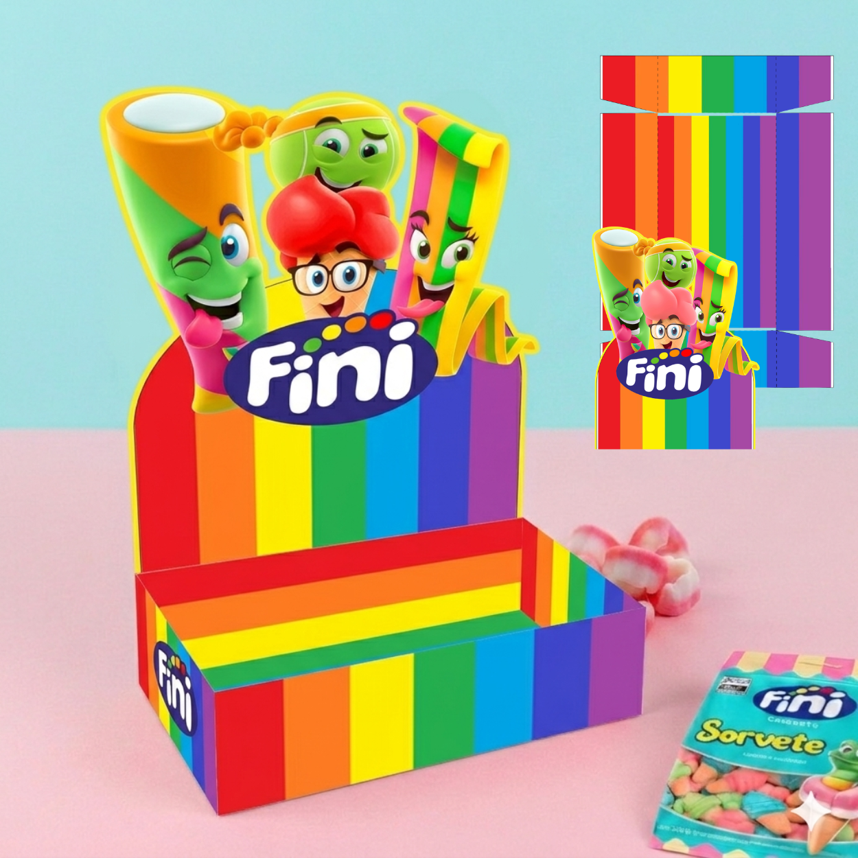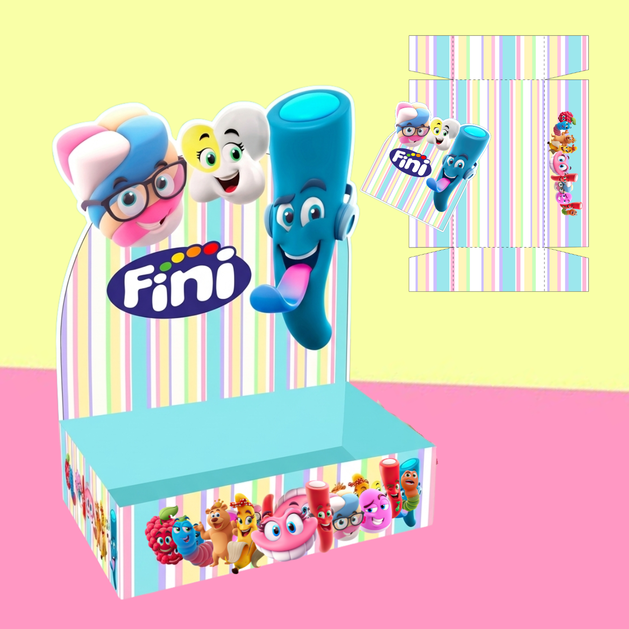 Arquivo digital com 12 modelos exclusivos de caixa temática Fini, ideal para montar kits de doces, lembrancinhas, presentes personalizados ou para venda.