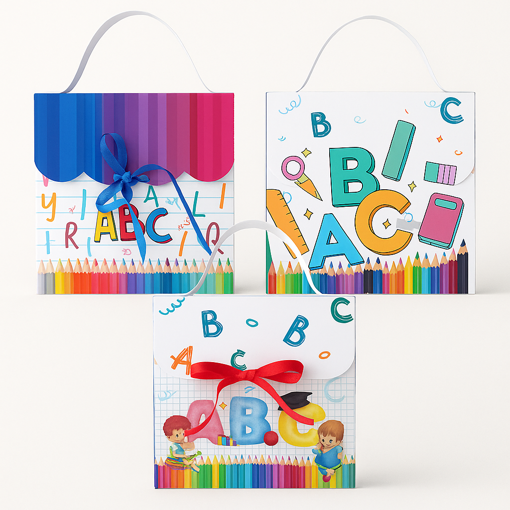 Receba um arquivo digital em PDF pronto para imprimir com 10 modelos de sacolas e maletas tamanho P (14x13x6cm).